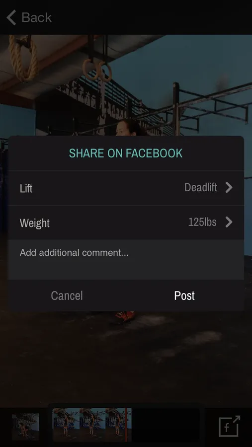 Add details to your lift (name/type, weight and comments) before you share it on Facebook
