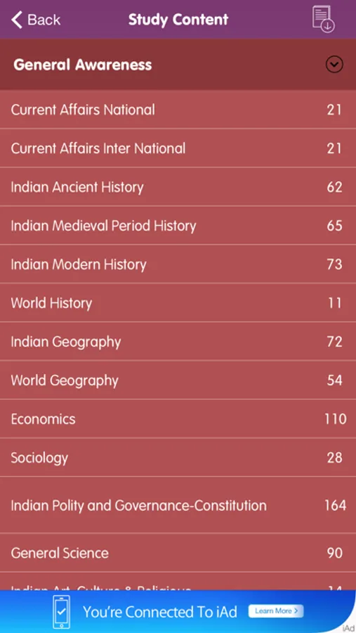Show categories and subcategories. As per selection, display questions of that category. Questions can be viewed in test mode or reading mode. In test mode, user should select right answer and check for right or wrong. In reading mode, user will be shown right answer with the question. Questions can be marked as favorite.