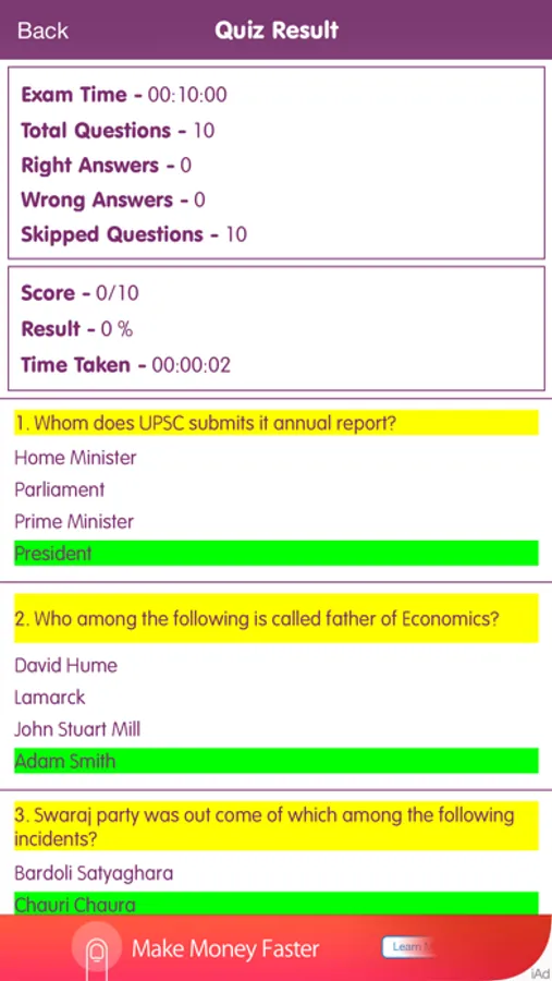 In the end of test, we show complete quiz analysis. Here we show, user selected answers with right answer. How much time user has taken and what %marks he scored.