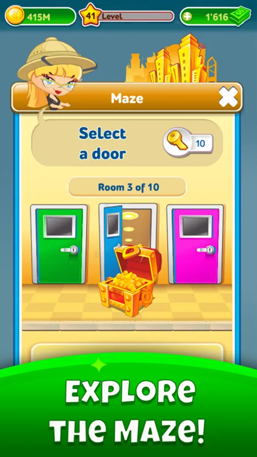 Like keys to the labyrinth. If you open all 10 doors of the labyrinth and never hit a dead end, you'll get a spectacular reward: a chest full of gamer's treasure—gold coins, bucks, and other cool stuff you can use to expand your business.