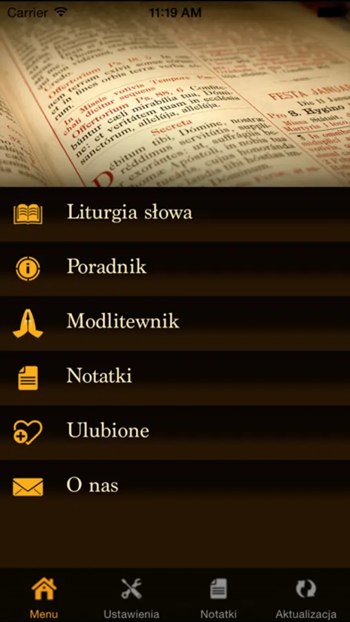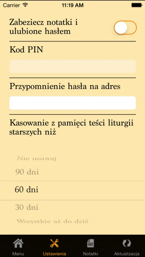 - opcję prowadzenia osobistego notatnika duchowego zabezpieczonego kodem PIN;