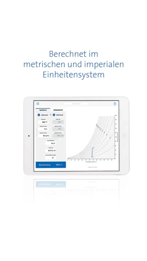 die Heizleistung (bei adiabater Luftbefeuchtung) sowie das der Berechnung zugrundeliegende h,x-Diagramm. Die Software kann eine Berechnung im metrischen wie auch im imperialen Einheitensystem durchführen.