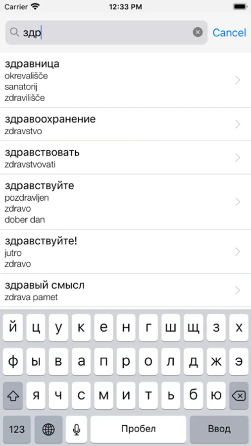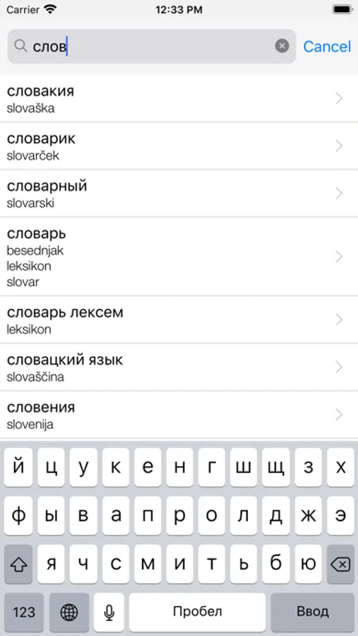 Dictionary contains more than 70.000 words. Doesn’t require connection to internet. Allows quickly find needed word and see its translation immediately without additional tap.