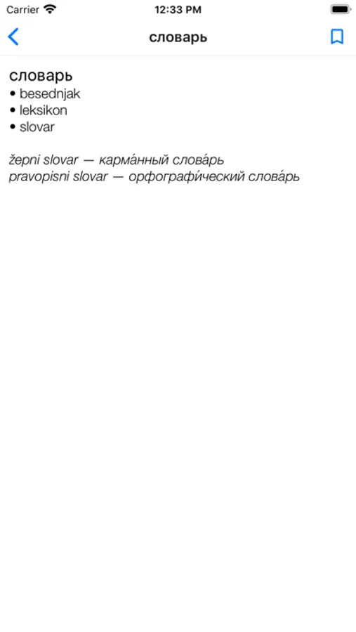 Ravno tako vsebuje primere rabe jezika, dovoljuje dodajanje v priljubljene ter vsebuje zgodovino iskanja. Ruske besede se izpisujejo z naglasi.