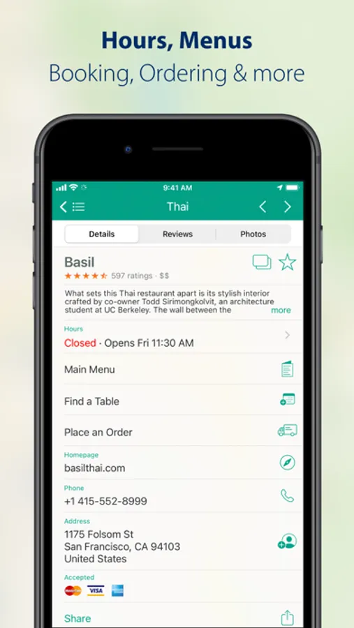 Where To? is your local guide in your pocket! It provides you with dinner menus, photos, videos, business hours, and more details. All you have to do is choose — then make a reservation, order your meal, or check the place’s homepage.