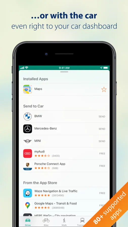 Turn the key and let your car guide you to the destination. You can send locations to supported onboard navigation systems (Audi, BMW, Mercedes-Benz, Mini, Porsche).