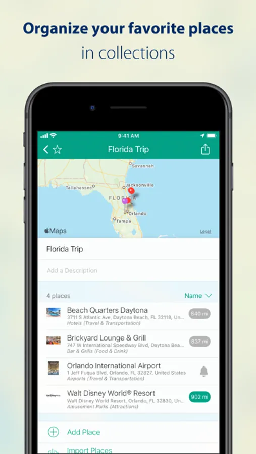 Save your favorite places and organize them in collections. Import collections from KML or GPX. Share places and collections with your friends.