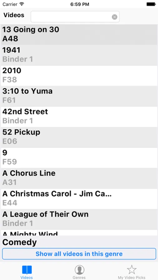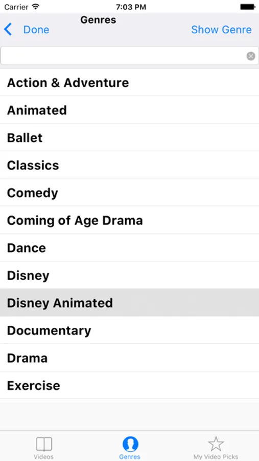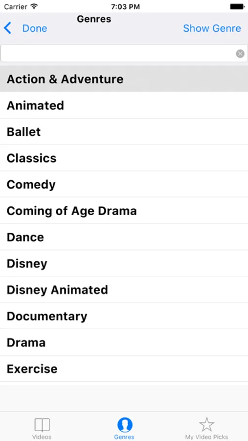 MyVideoList puts your list of videos right in your pocket. Load your own list by dragging videos.txt from MyVideoList Helper into the documents folder of your iPhone using iTunes. Your favorite movies can be found easily by name using the search box and then added to your personal pick list by tapping the video and tapping the add button. See only the movies in a particular genre by tapping the Genre tab, selecting the genre (ie.: Action/Adventure) in the genre list and clicking Show Genre. Click Pick 6 in your picks list to add 6 random videos from the videos list. You'll be surprised how much fun you'll have!