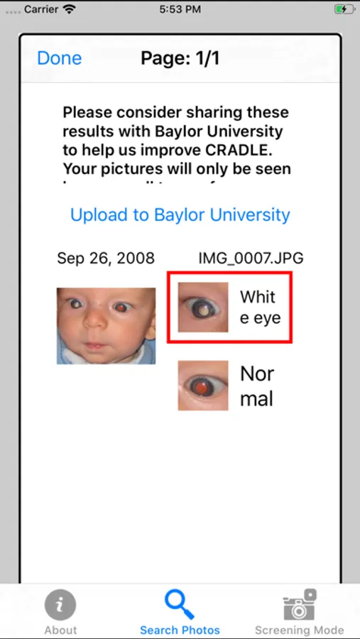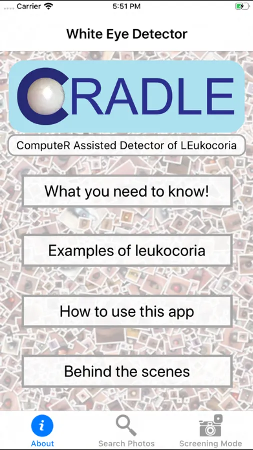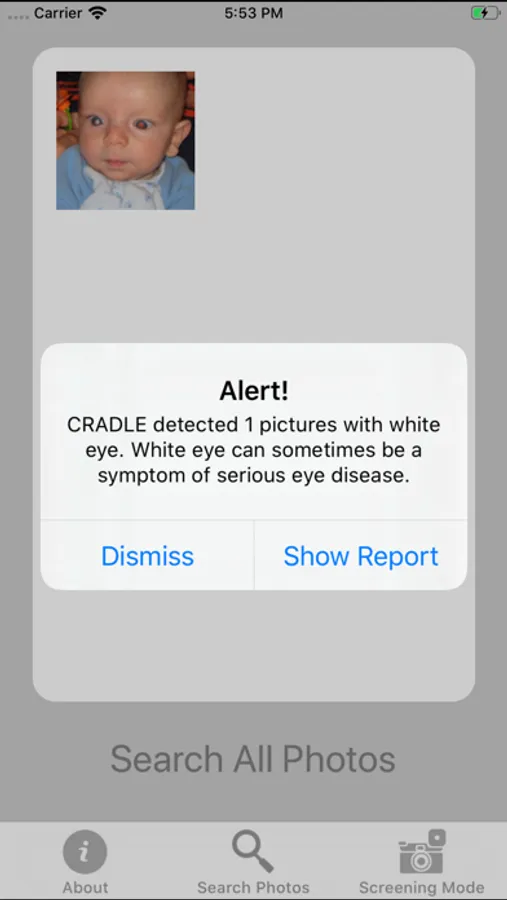 The CRADLE White Eye Detector app helps parents detect the appearance of white eye in pictures of their children. A white pupil can be a normal photographic effect in pictures (like red eye, but white). White eye can also be a symptom of multiple serious eye diseases such as retinoblastoma, pediatric cataract, and Coats' disease. These diseases are often first detected by parents because the parent notices white eye in pictures of their children. This app will find pictures on your iPhone or iPad that have white eye, and will show you these pictures so that you can inspect them for yourself.