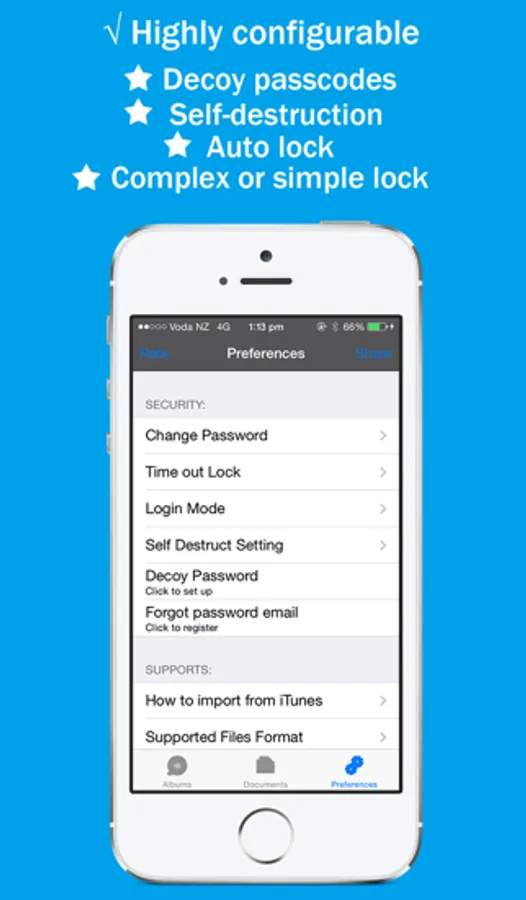 √ Simple 4-digit and complex passcodes protection.