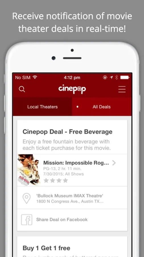 Cinepop is the fastest way to find movie times and receive exclusive deals and discounts for movie tickets and concessions at movie theaters! Simply find and follow your favorite movie theaters on Cinepop, and get real time deals, discounts, and coupons pushed directly to your phone.