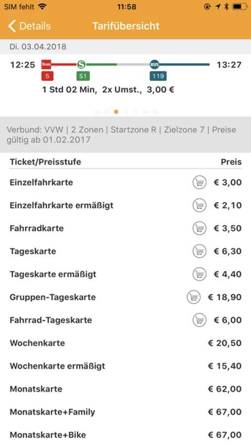 Für Verbindungen innerhalb des Verbundgebietes (außer Mollibahn) erhalten Sie eine Preisauskunft. Hier haben Sie dann auch die Möglichkeit Ihr Ticket direkt in der App zu kaufen.