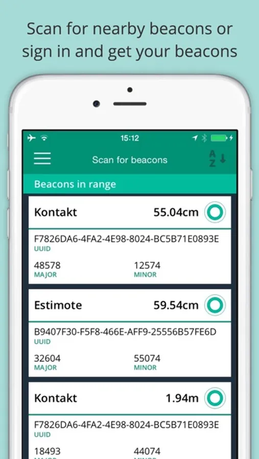 Dartle.io's iBeacon Locator helps you find nearby bluetooth beacons for a broad range of different manufacturers.  The app provides you with real-time information about the proximity, major, minor and UUID when an iBeacon is found.