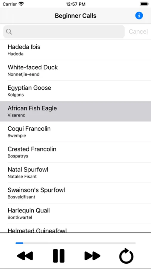 Features 99 bird calls taken from the Len Gillard Collection of Southern African Bird Calls. Afrikaans names included. Compiled by Alan Reid.