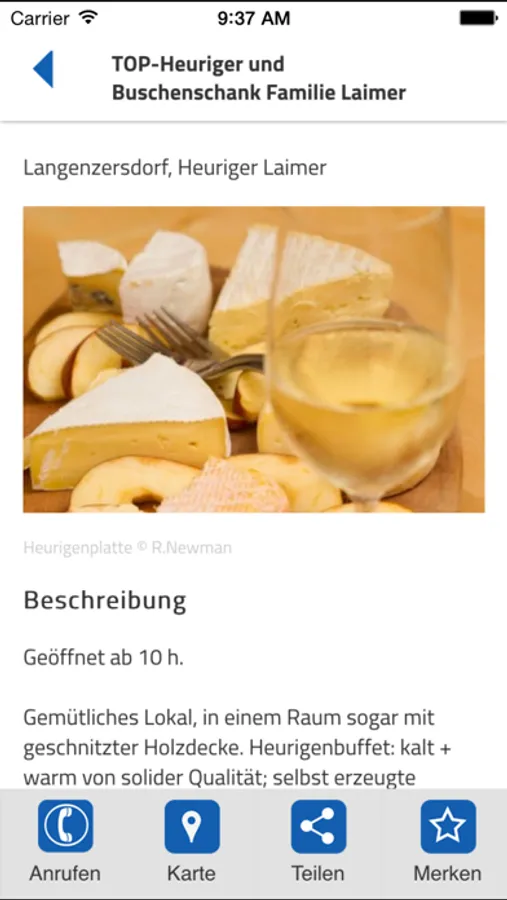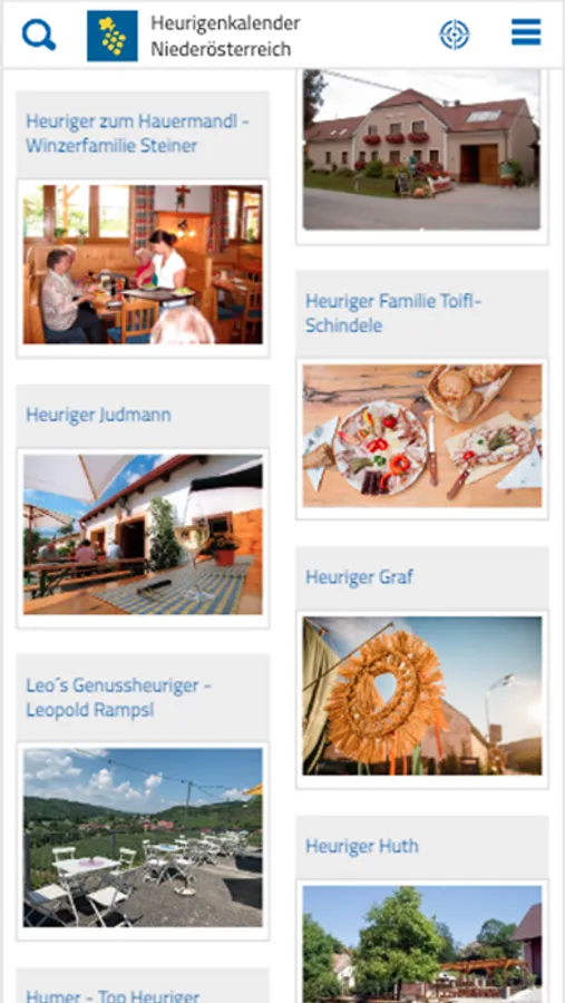 Die App umfasst alle Termine der Kellergassenfeste, Most und Weinheurigen, Bier- und Weinfeste, Weinverkostungen; Es sind alle Top-Veranstaltungen rund um Weinfrühling und Weinherbst, die Öffnungszeiten der Top-Heurigen und die Heurigentermine der Weinstraßen-Betriebe zu finden; Die Ergebnisse können auch nach Weinbaugebiet (Carnuntum, Kamptal, Klosterneuburg, Kremstal, Südliches Weinviertel, Thermenregion, Traisental, Veltliner Land, Wachau, Wagram, Westliches Weinviertel) gefiltert werden.