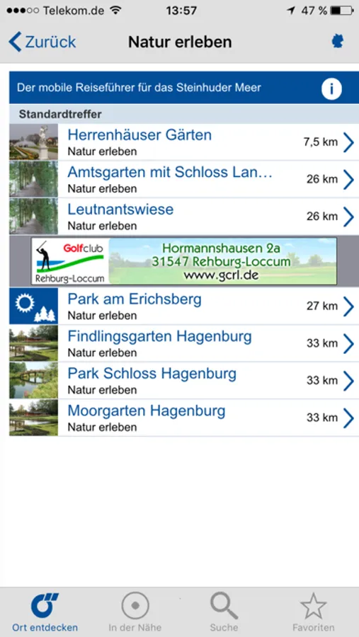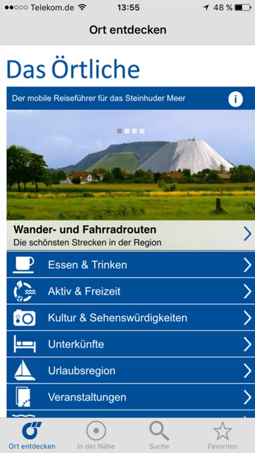 Erkunde die Kulturlandschaft Steinhude zu Fuß oder mit dem Rad, wandere an den Uferpromenaden, Mooren und Feuchtwiesen entlang oder entspanne auf der beliebten Badeinsel Wilhelmstein - die Steinhuder Meer-App hilft Dir dabei, die richtigen Wege zu finden. Ein detaillierter Veranstaltungskalender zeigt Dir, was in der Region um Steinhude, Neustadt und Mardorf los ist. Treibe Wassersport, gehe Golfen oder begib dich zum Segeln oder Surfen direkt aufs Steinhuder Meer. Suche Hotels, Ferienunterkünfte oder Campingplätze in der App und buche direkt Dein Urlaubsquartier. Der Wetterbericht in der Reiseführer-App, zahlreiche Ausflugstipps und beliebte Sehenswürdigkeiten helfen Dir ebenfalls dabei, Deine Ferien am Steinhuder Meer bestmöglich zu planen. Lade Dir jetzt die kostenlose Steinhuder Meer-App als mobilen Freizeitführer herunter und entdecke Niedersachsens Naturpark Steinhuder Meer!