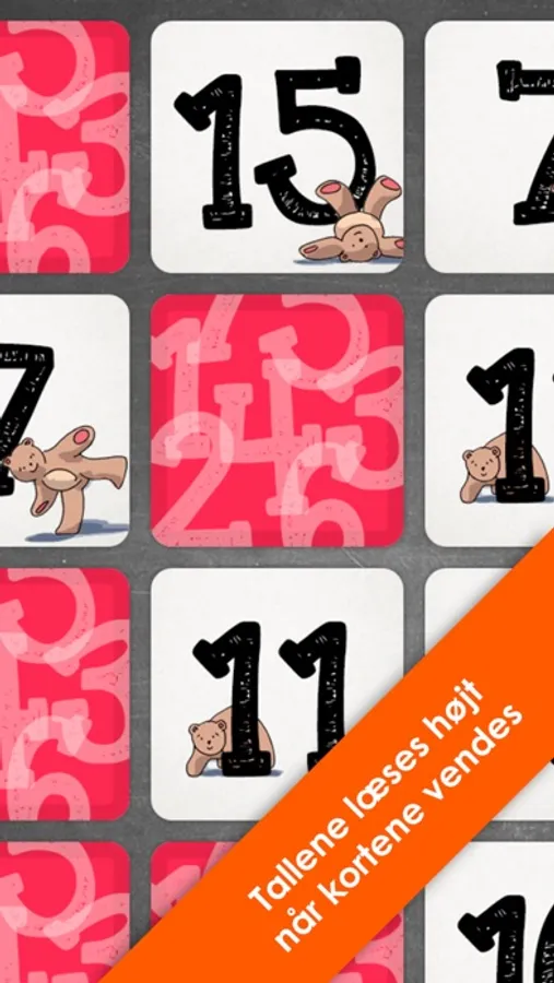 I “123 huskespil” lærer barnet tallene fra 1-20. Spillet går ud på at finde ens kort og kan umiddelbart forståes og spilles af alle. Når et kort vendes læses tallet højt.