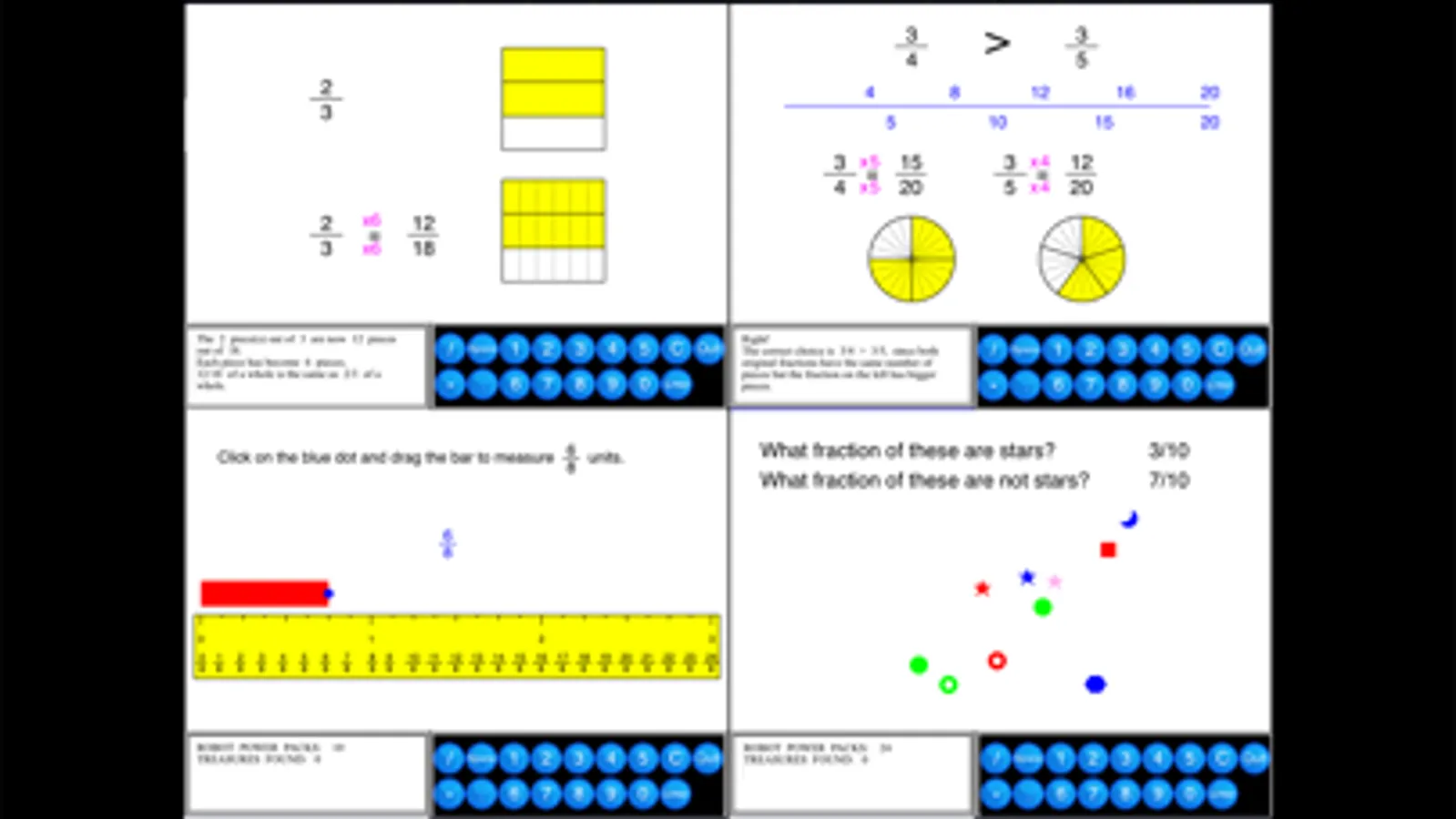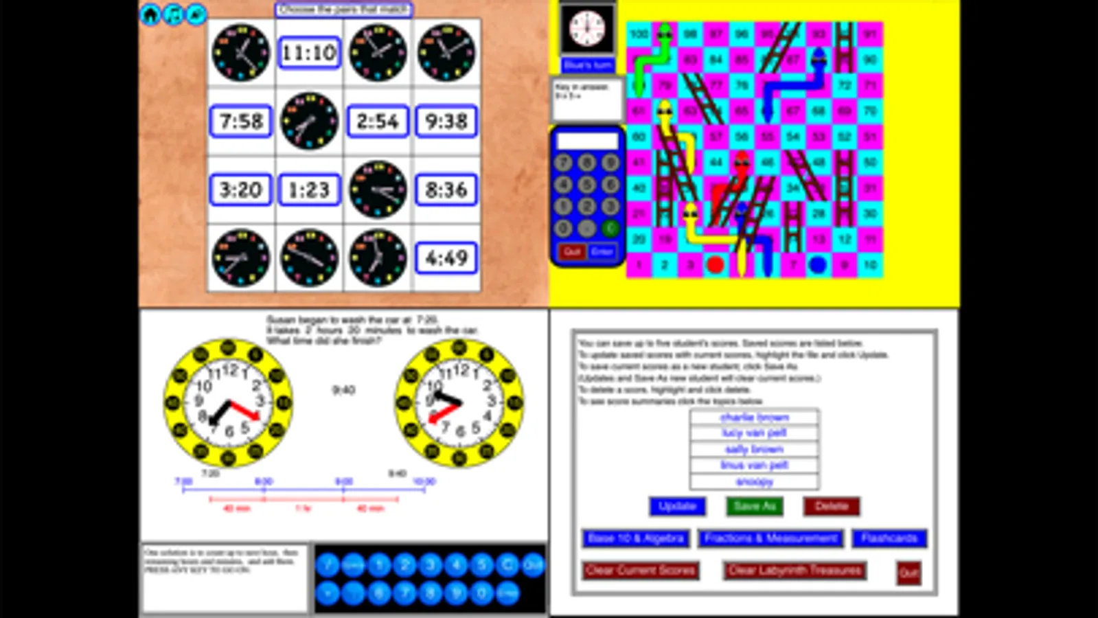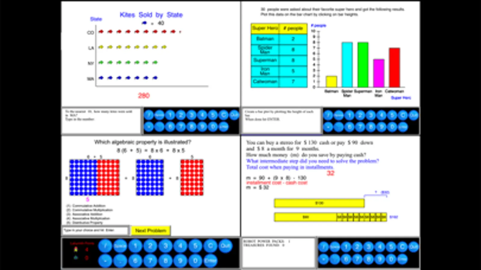 By solving problems students earn robots to use in a maze game, plus other math games and flashcards for all four operations.