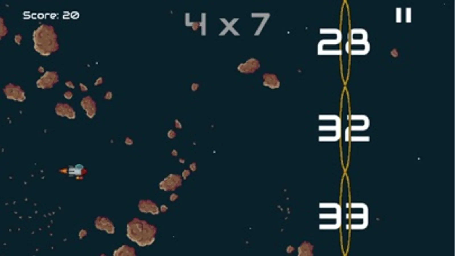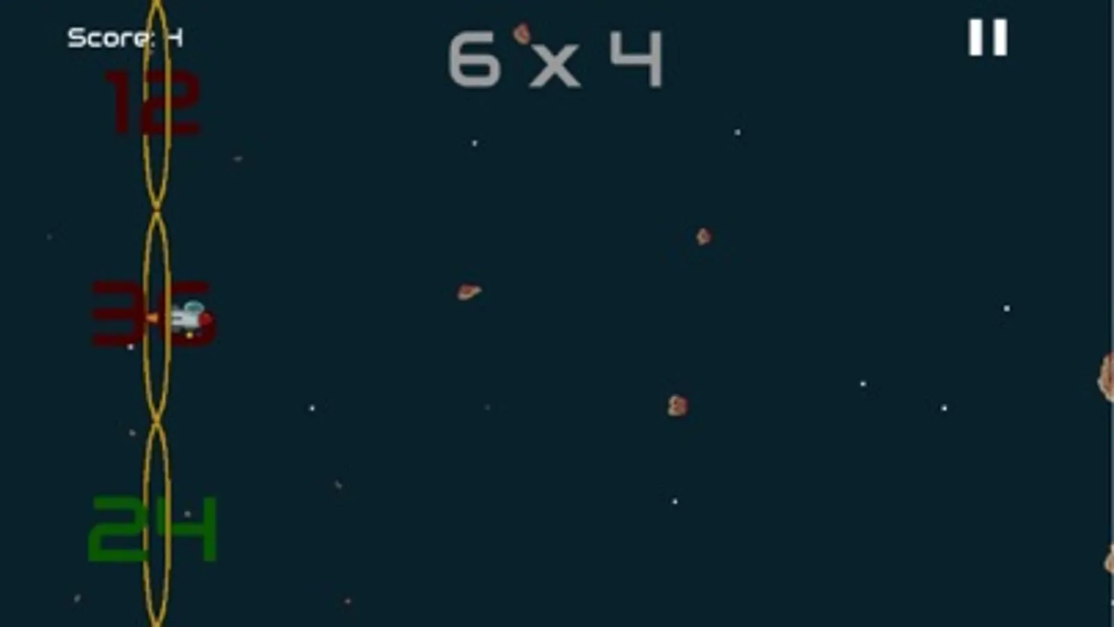 Mission: Multiplication takes the simple concept of multiplication flashcards and turns it into a game. Thus allowing for the practice of multiplication for younger children, without the boredom that inevitably results from such a monotonous, yet important topic. The premise of the game is that you are a rocket, flying through space and destroying asteroids. Along the way, you come across different multiplication equations, as well as rings with different possible answers. Your score is a combination of both the number of asteroids you destroy, as well as the number of questions you answer correctly.