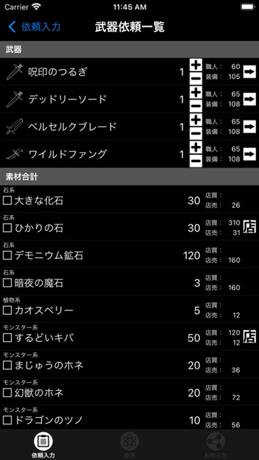 ・登録した依頼品(作成数分)の合計素材(レシピ)を確認