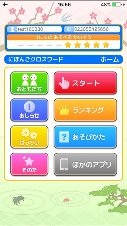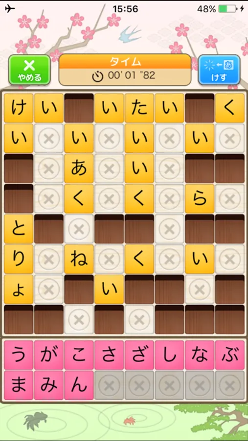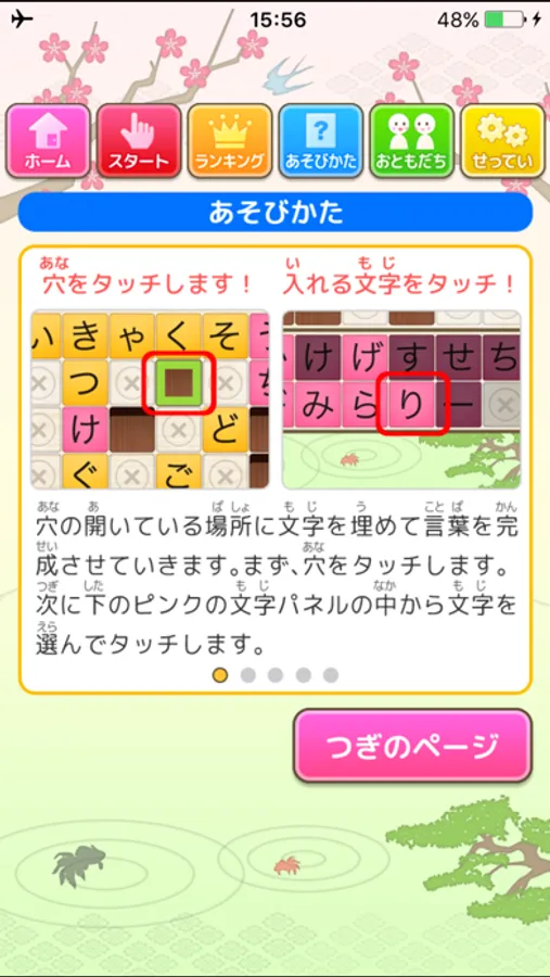 穴の開いている場所に文字を埋めて言葉を完成させていくアプリです。