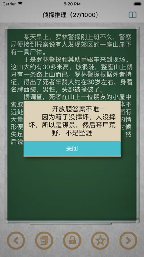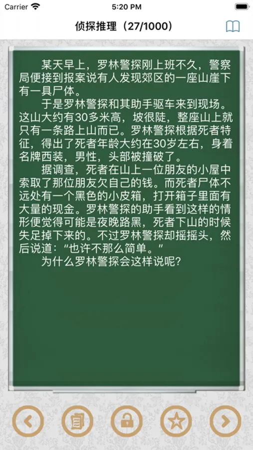 本应用精心收录了1000条侦探推理题,并且每个推理题都有相应的推理答案,是一款非常休闲、益智的应用,用户还可以对题目进行收藏、复制等操作。一起来挑战自己的脑力吧!