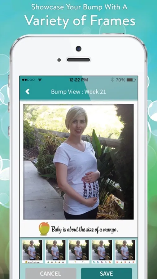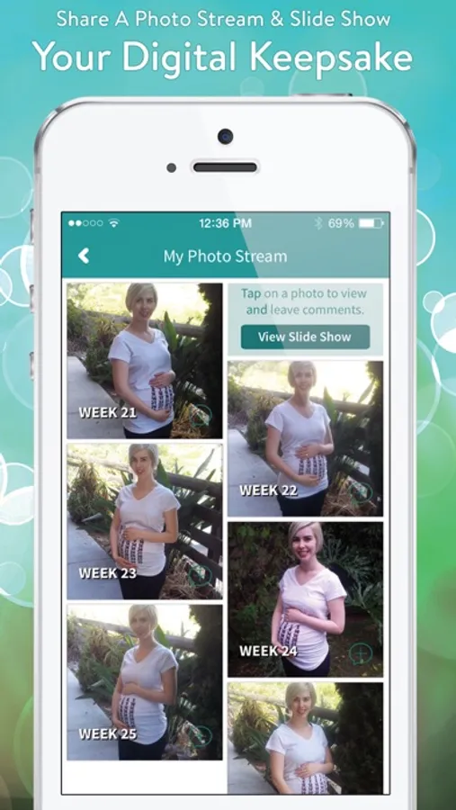 • Once 4 weeks of photos have been saved, you and your viewers can utilize the slide show feature to watch your bump grow. This is an amazing experience to view at the end of your pregnancy.