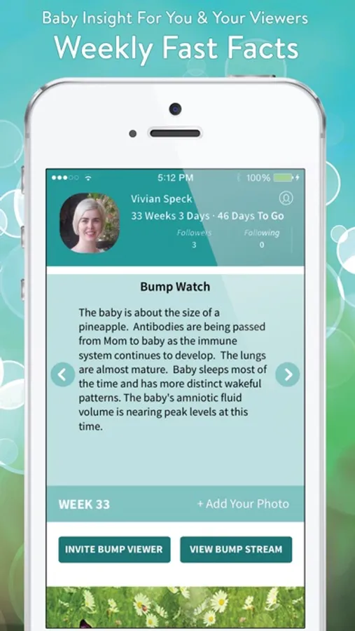 • Set your due date and Bump View will automatically match up your current week of pregnancy. You can start sharing your photos with invited users as early as the 12th week.