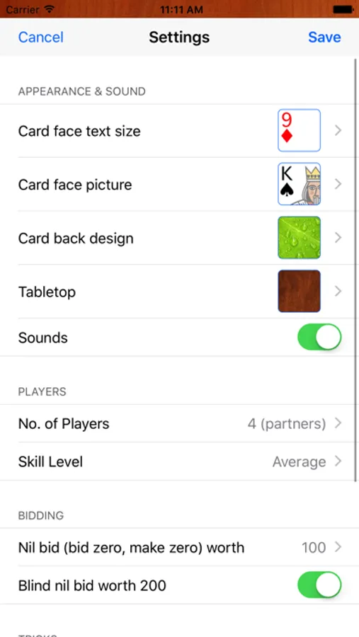This app allows you to configure number of players and teams, the appearance of the table and cards, rules about nil bids and when spades can be lead. There are instructions included in the app, as well as a setting to make your robot opponents less aggressive or more aggressive.