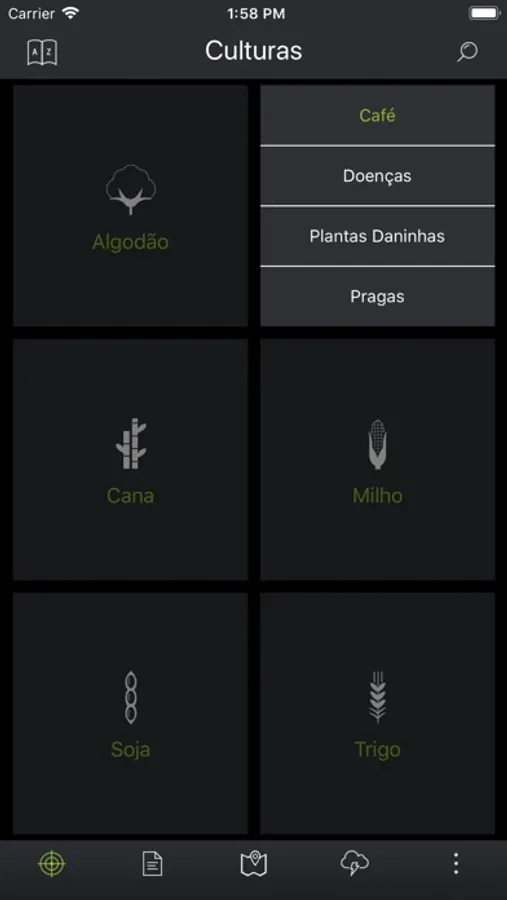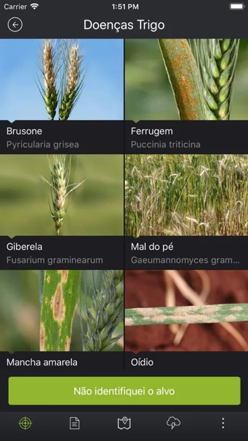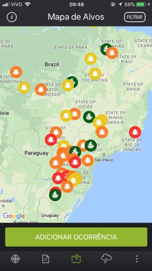 - Mapa de alvos: ferramenta colaborativa onde usuários podem reportar infestações de pragas e escapes de controle de plantas daninhas nas culturas do app
