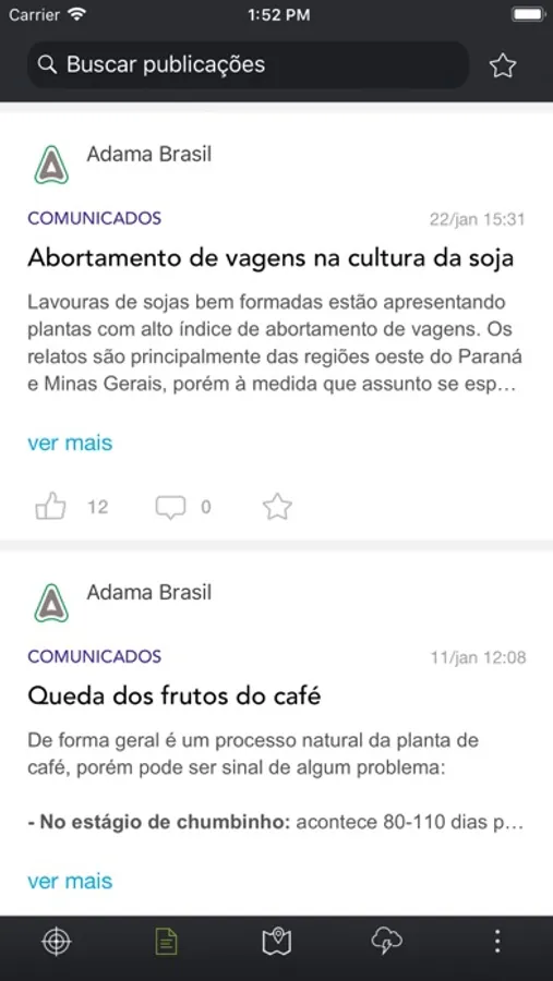- Conteúdo Adama: menu de publicações da Adama sobre notícias do mercado agro. Notificações direcionadas por culturas e região
