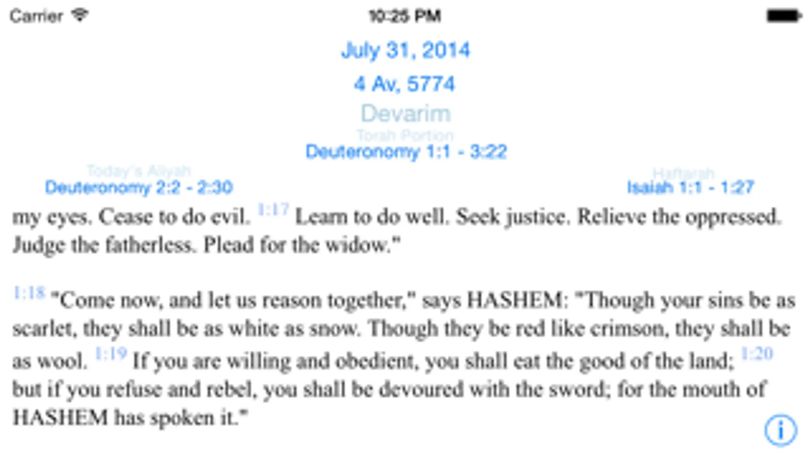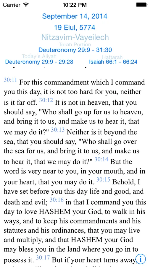 All Scripture passages are displayed in English, in a modified version of the World English Bible (public domain). Compete text of the Torah included, broken down by weekly parasha. Parashiot follow Ashkenazi Diaspora rules.