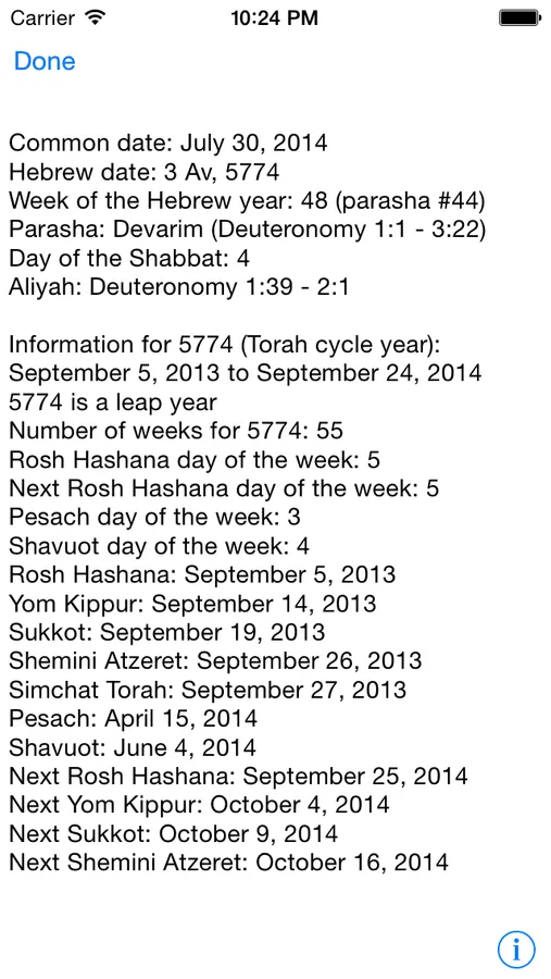 Moadim converts common English dates to Hebrew dates and vise versa. It displays the weekly Torah and haftarah portions in English text. Daily aliyah text is also included for every date.