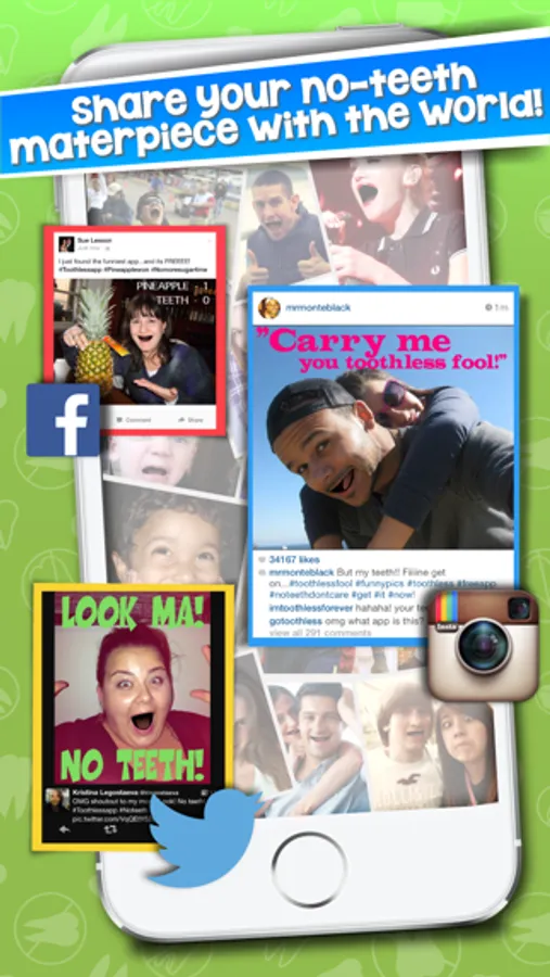•Toothless lets you share your new gummy-grin via Instagram, Twitter and Facebook for all your friends to see!