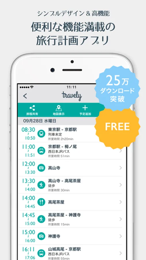 シンプルかつ高機能、予定の自動作成やトラベルラインなど、便利で楽しい機能が盛り沢山です。