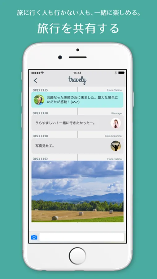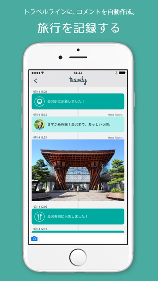《新機能トラベルライン》 作成された予定から、「トラベルライン」上に自動でコメントを作成。旅先でコメントや写真を追加することができます。「トラベルライン」を使えば、旅に行く人も行かない人も、みんなで一緒に楽しめます。※トラベルラインは、メール、LINE、SMSを使って簡単に共有することができます。