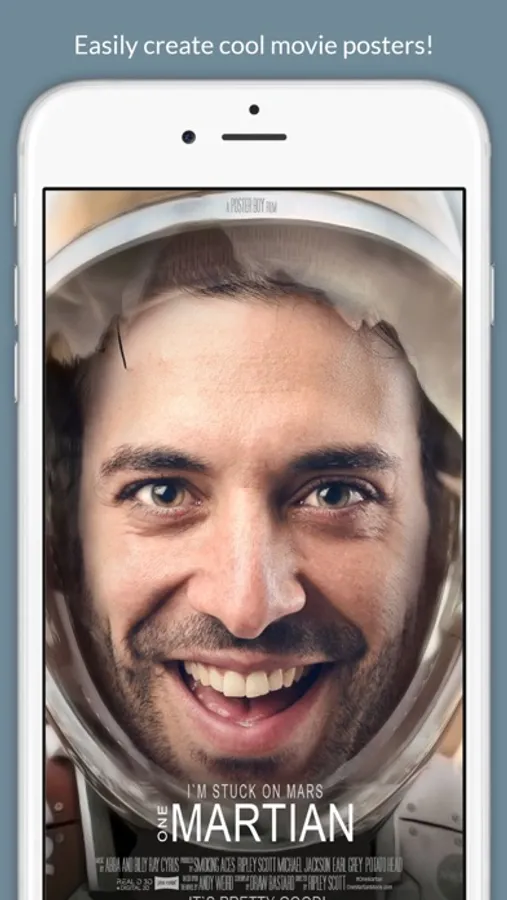 When you are happy with your poster, you can save it as a regular poster, as a “billboard”, a “blu-ray” cover, or as a “bus-stop” ad. It looks pretty amazing, and your friends will be blown away when they see your face on a “world famous” movie poster! Easily share the poster to social medias from within the app!