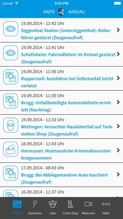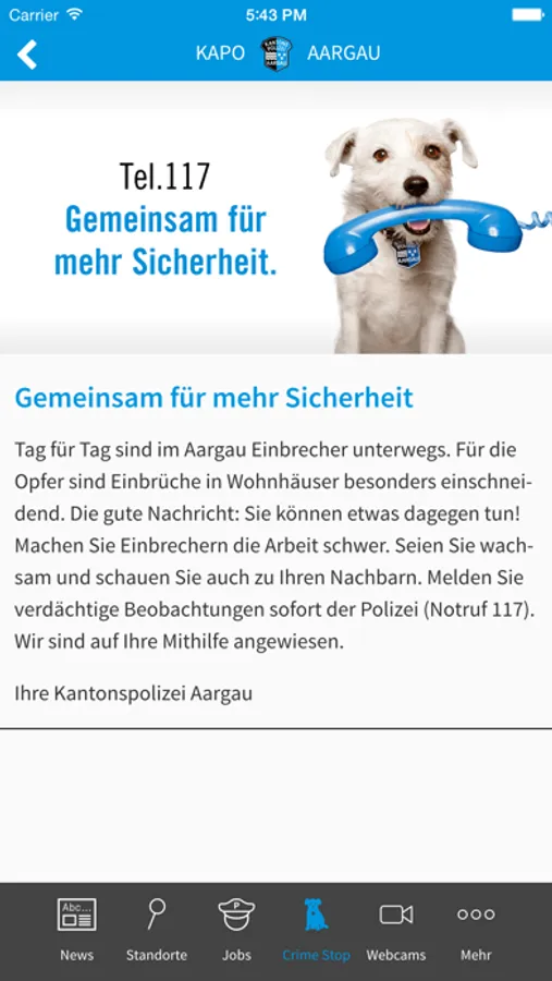 Das App «KAPO Aargau» der Kantonspolizei Aargau informiert Sie über das Geschehen im Kanton. Es ermöglicht Ihnen zudem Zugriff auf Fahndungsaufrufe, Präventionsmassnahmen oder Informationen zu den vielfältigen Polizeiberufen.