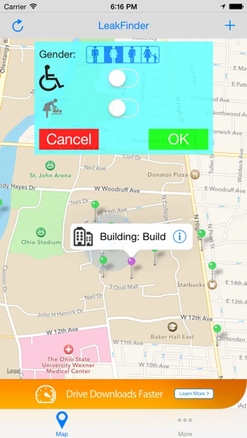 * New!! Change the search criteria easily. The search criteria is not related to your gender anymore. Just tap the app name at the top of the map screen (the words "LeakFinder", and a pop-up search criteria will appear.