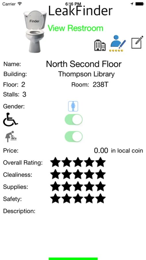 You can also modify an already existing restroom!! Just hit the "Modify" icon at the top of the "view restroom" screen.