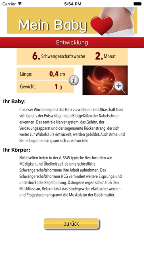 Als besonderes Extra gibt der Menüpunkt "Entwicklung" interessante Informationen über Größe, Gewicht, sowie wichtige Entwicklungen in jeder Schwangerschaftswoche.