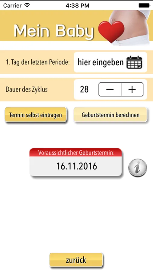 Diese praktische "Mein Baby - Ich bin schwanger" App ist der ideale Begleiter durch die Schwangerschaft. Der voraussichtliche Geburtstermin kann entweder direkt eingegeben werden, oder durch Angaben zu Zeitpunkt und Dauer der letztzen Periode errechnet werden.