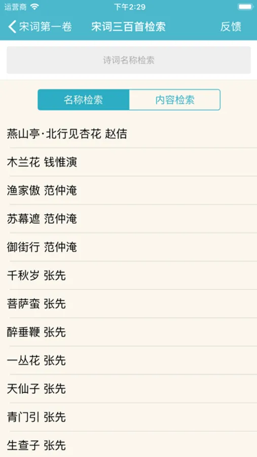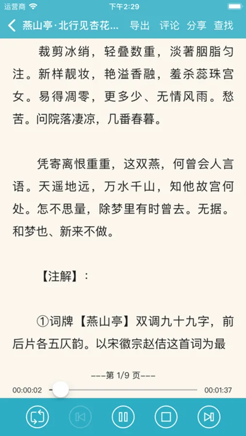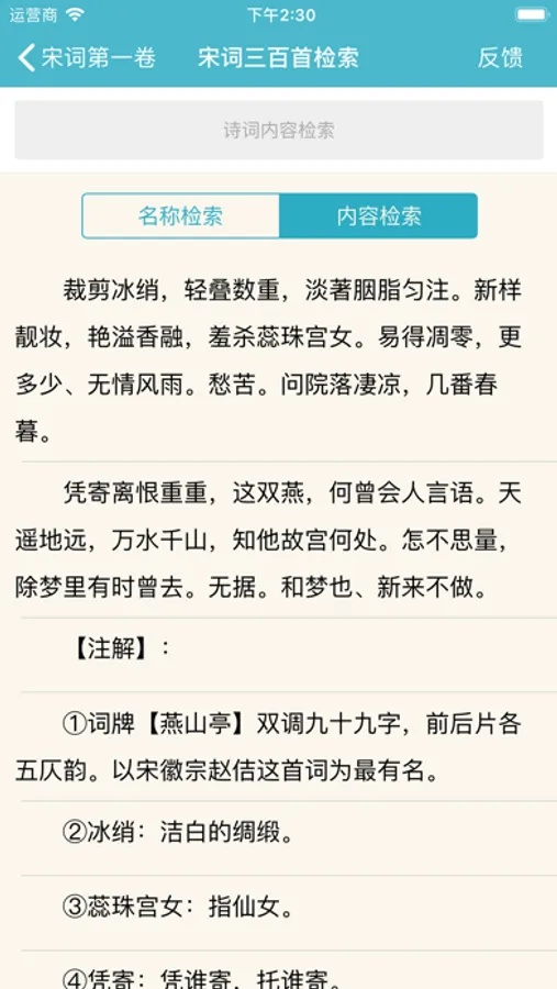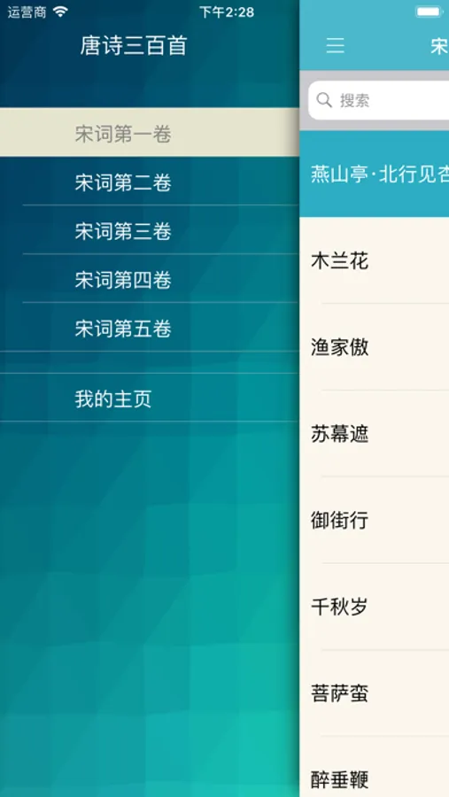 该应用中,可以单首与顺序重复播放宋词,可以暂停,支持后台与锁屏下播放。随时随地不仅可以阅读宋词,更可以听宋词了。