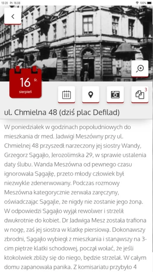 Nowa kartka z kalendarza pojawi się codziennie w Twojej aplikacji wraz z nadejściem dnia, którego dotyczy. Korzystaj z naszego kalendarza, przeglądaj zdjęcia i wydarzenia w Warszawie. Szukaj miejsc na mapie stolicy i zobacz, jak dziś wygląda ta część miasta. Zrób zdjęcie i dodaj do aplikacji.