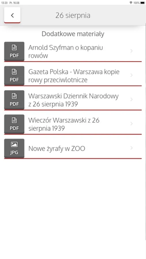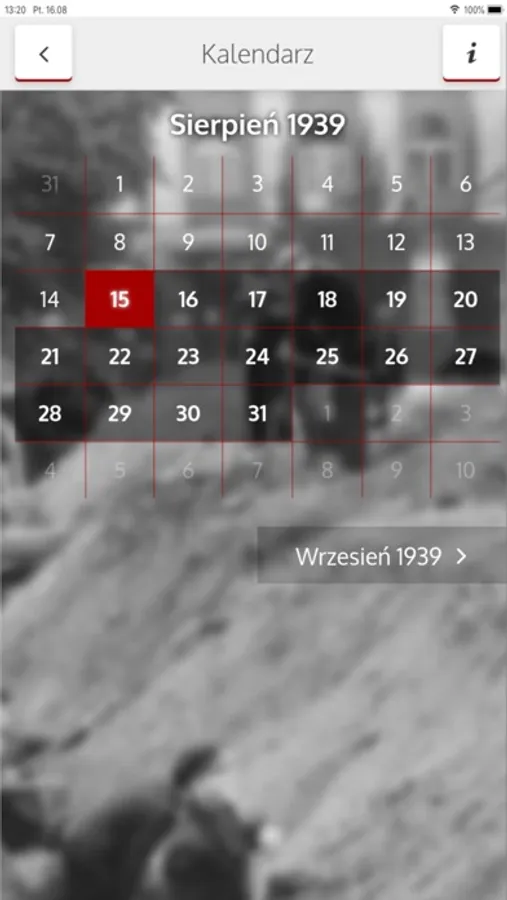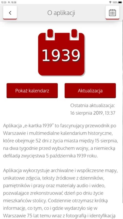 Aplikacja „e-kartka 1939” to fascynujący przewodnik po Warszawie i multimedialne kalendarium historyczne, które obejmuje 52 dni z życia miasta między 15 sierpnia, na dwa tygodnie przed wybuchem wojny, a niemiecką defiladą zwycięstwa 5 października 1939 roku. Aplikacja wykorzystuje archiwalne i współczesne mapy, unikatowe zdjęcia, teksty źródłowe z dzienników, pamiętników i prasy oraz materiały audio i wideo, pozwalające zrekonstruować dzień po dniu życie mieszkańców stolicy.