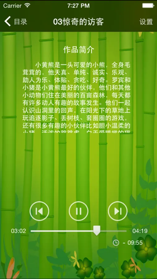 小黄熊和它的朋友们有许多有趣的故事,伴随着轻快的音乐和丰富的音效,适合小朋友晚上入睡的时候听,小朋友听着听着就睡着了,快让您的宝宝与小黄熊和它的朋友们一起,加入到探索奇妙世界的行列中来吧!