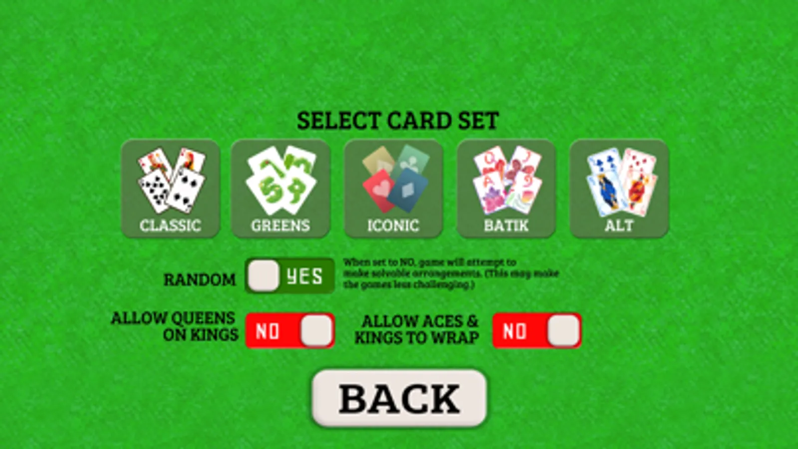 • Option to toggle rules to allow Queens on Kings and wrapping Aces.