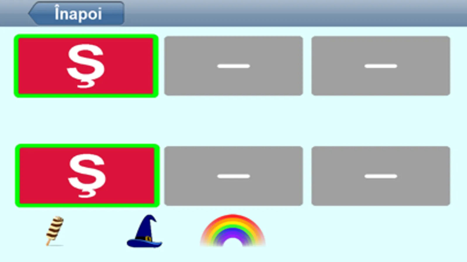Grupează de aceeași culoare-nivel de dificultate ridicat.Toate cardurile sunt de aceeași culoare.Copilul potrivește doar prin identificarea literei.Selectează carduri potrivind simbolul-Fără ajutorul culorii cardului.