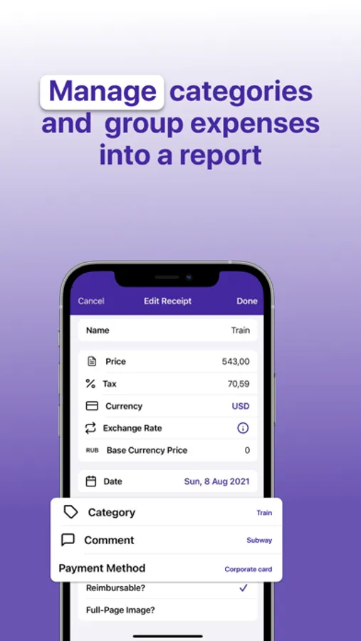 • Tag receipt names, categories, payment method, comments, and other metadata