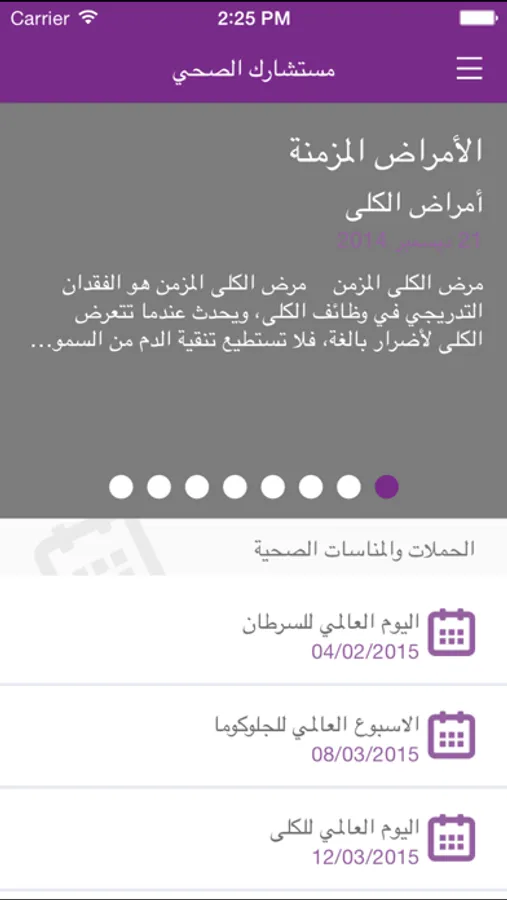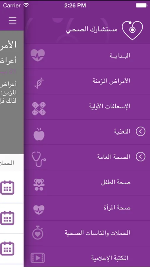 وكذلك يوجود تقويم لكافة الأيام الصحية العالمية والمناسبات الصحية المحلية.